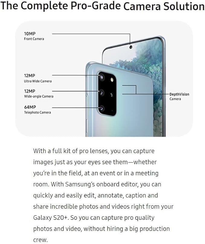 - Rear Camera: 64MP, f/2.0 + 12MP, f/1.8 + 12,MP, f/2.2 + 0.3MP, TOF, Front Camera: 10MP, f/2.2